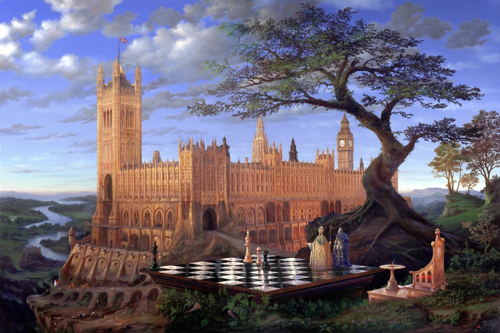 The painting contains many themes, but central to the work is the idea that politics are like a never-ending game of chess.The painting was exhibited in the Daily Mail Not the Turner Prize Exhibition in 2003 where it was shortlisted as a finalist.