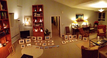 Preparing for the exhibition: about a third of the paintings were framed at this point.