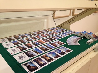 The cards in a display cabinet at the exhibition