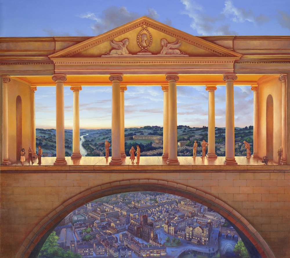 The Royal Crescent and the Circus can be seen through the colonnade. Pulteney bridge with its row of shops on the bridge itself, built by Robert Adam, can be made out in the bottom right hand corner of the painting. (Private Collection)