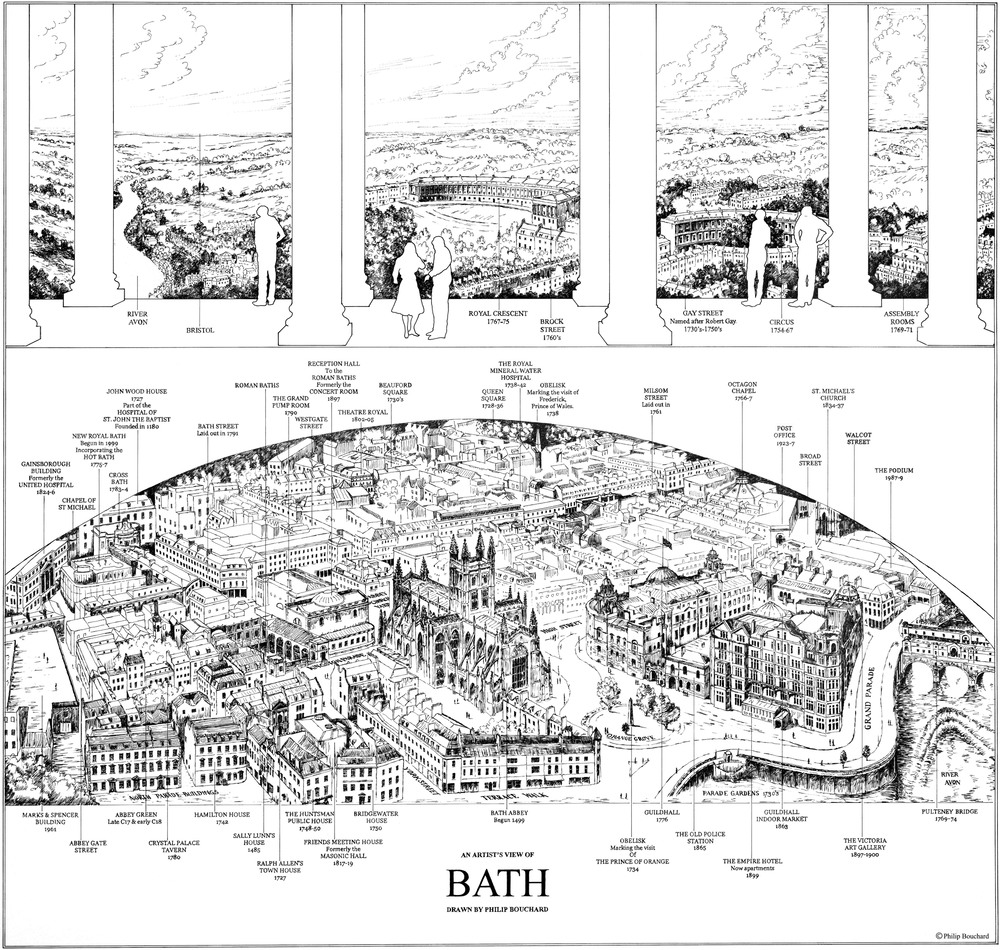 This is an aerial view of Bath showing many of the landmarks such as the Royal Crescent and the Roman Baths. The imaginary 'aerial' bridge is inspired by a small, beautiful colonnade in Abbey Church Yard, in the centre of Bath. The view is of the city facing West, towards Bristol.